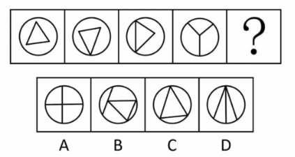 【分析:】观察发现,题干图形均由圆形外框和内部直线构成,且内部直线与外框有明显交叉,考虑框上交点数,题干图形的框上交点数依次为0、1、2、3,故?处应选择框上交点数为4的图形,排除C项;继续观察发现,题干前三幅图形中均出现三角形,考虑直线数,题干图形的直线数均为3,故?处应选择直线数为3的图形,只有D项符合。故正确答案为D。