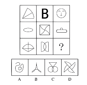 【分析:】观察发现,曲线特征明显,考虑数曲线。九宫格,横向规律较为常见,优先考虑。第一行中曲线数依次为1、2、3,呈等差规律;第二行验证,符合规律;第三行应用规律,前两幅图曲线数依次为1、2,只有B项符合。因此,选择B选项。