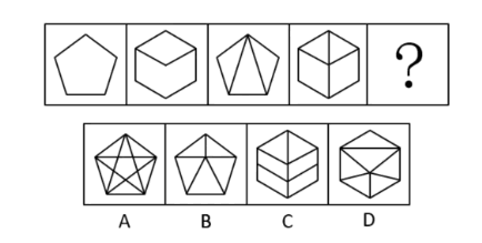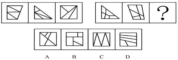 【分析:】观察发现,图2到图4图形均被分割为多个封闭空间,考虑面数量。题干图形的面数量分别为:1、2、3、4、?,则?处应为5个面的图形。A项11个面,排除;B项5个面,当选;C项6个面,排除;D项6个面,排除。故正确答案为B。