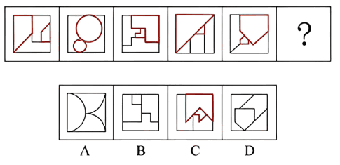 【分析:】图形元素组成不同,且无明显属性规律,考虑数量规律。观察发现,题干每幅图都是由直线构成,存在直线相交且出现明显的直角,优先考虑数直角数。图形大多分为内、外两部分,考虑分开数直角数。外框图形直角数依次为0、1、2、3、4、“?”,所以“?”处应该选择一个外框直角数为5的图形,只有B项符合。