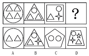 【分析:】图形元素组成不同,且无明显属性规律,考虑数量规律。观察题干图形内部小元素种类,依次为1、2、3、?,则?处应为内部有4种小元素的图形,只有D项符合。故正确答案为D。