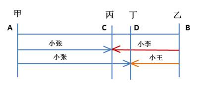 例2:(2019四川选调)小张从甲地出发匀速前往乙地,同时小李和小王从乙地出发匀速前往甲地,小张和小李在途中的丙地相遇,小张和小王在途中的丁地相遇。已知小张的速度比小李快一半,小王的速度比小李慢一半,则丙、丁两地之间的距离与甲、乙两地之间的距离之比为:( )