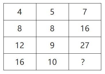 先考虑加法,第一个数阵:1+19+10+4=34,第二个数阵:23+13+6+2=44,第三个数阵:16+8+3+27=54,构成数列:34、44、54,此数列是公差为10的等差数列,则其下一项为54+10=64。即第四个数阵:10+4+ ?+19-64,则?=31。