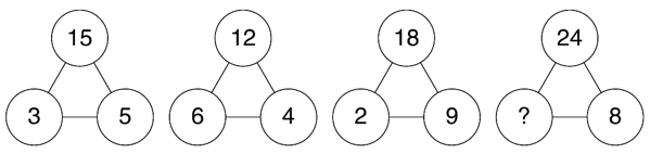 分析:中间的数字明显大于周围的三个数字,优先考虑加法或者乘法。外围三个数直接相加并不能得到中间的数,因此考虑加法与乘法相结合。发现(2+3)×5=25,(4+8)×6=72,(3+7)×9=90,则问号处的数字为102÷(8+9)=6,故本题答案为6。