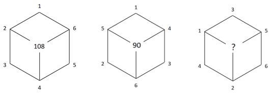 根据以上规律,第三个图形中,?=(1+2+5)×(3+4+6)=104。故正确答案为D。