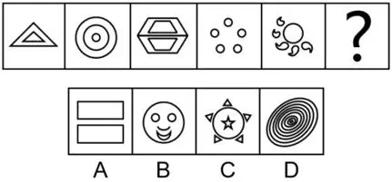 - 例6:从所给的四个选项中,选择最合适的填入问号处,使之呈现一定的规律性( )。