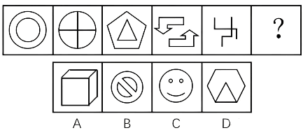 【分析:】图形元素组成不同,且无明显属性规律,考虑数量规律。观察题干图形内部小元素种类,依次为1、2、3、?,则?处应为内部有4种小元素的图形,只有D项符合。故正确答案为D。